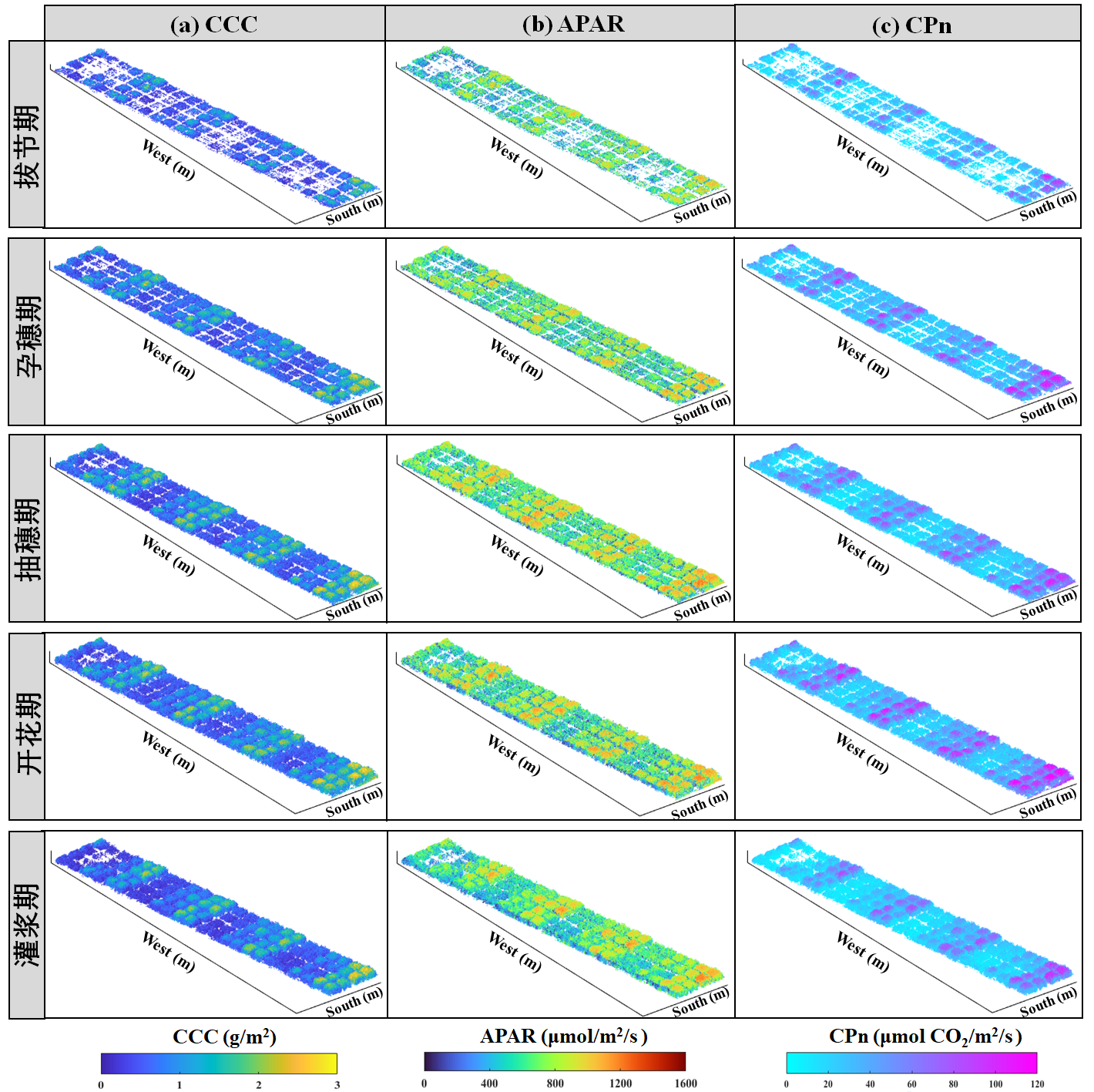 光合作用是作物生长和产量形成的物质基础。快速、实时地监测光合参数对作物营养诊断、胁迫监测、光能利用和产量预测具有重要意义。传统被动光学遥感方法已被证明可有效的监测作物光合性状。然而,该方法只能获取作物二维光合性状,难以获取作物三维光合性状。本研究利用激光雷达(Light detection and ranging, LiDAR)点云和多光谱影像进行融合,生成作物多光谱点云,从而估算作物光合相关参数的三维空间分布。