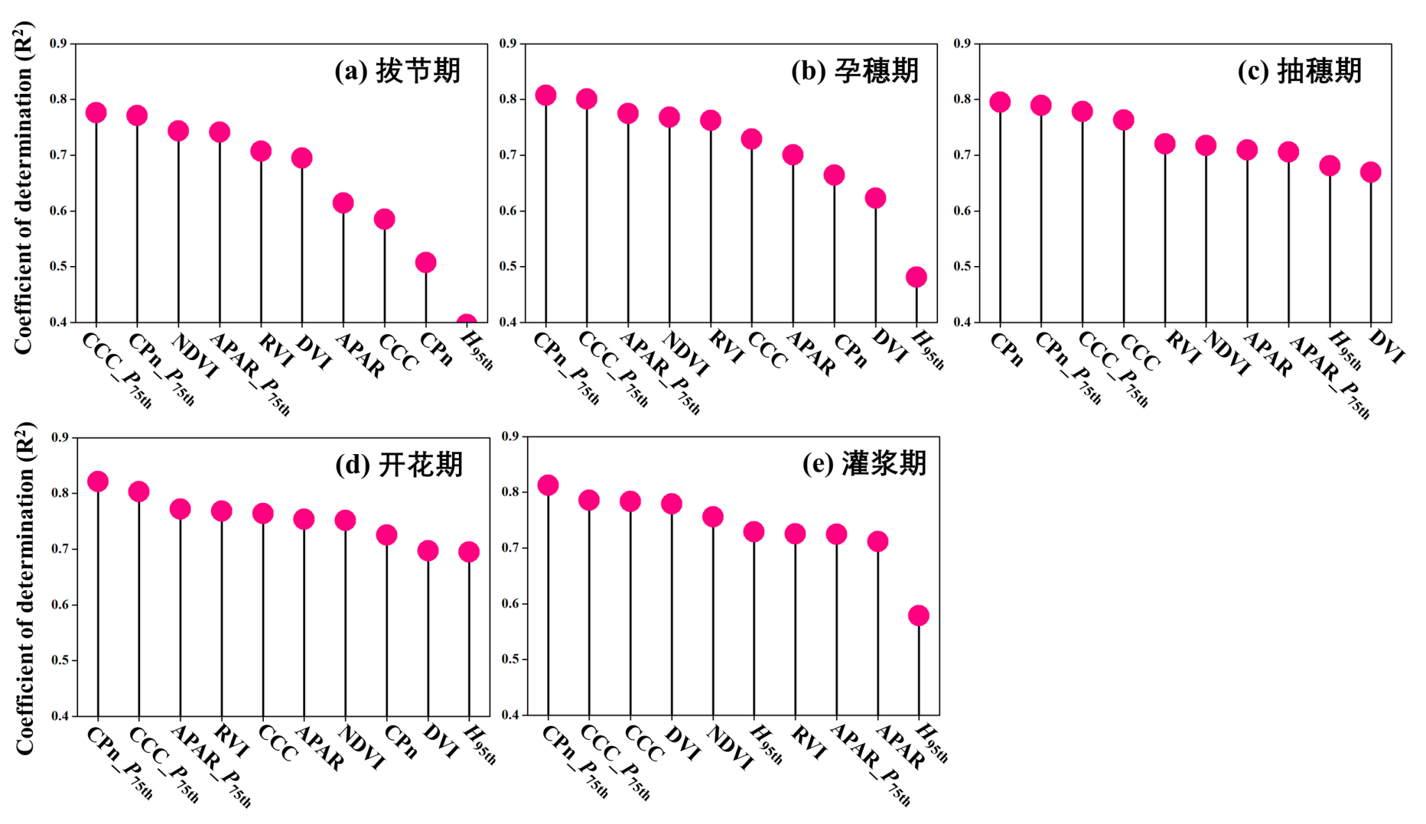 进一步基于小麦光合参数三维空间分布,筛选并新建兼具结构和生理信息的三维光合新指标CPn_P75th和CCC_P75th,这些指标相比于传统遥感指标和农学性状对作物产量表型具有更好的指示能力(图3)。