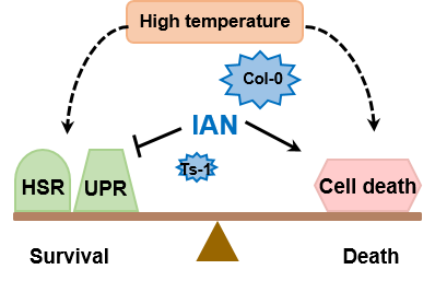 该研究通过对拟南芥90个自然变种生殖期的耐热性的全基因组关联分析,鉴定到一个调控拟南芥生殖期耐热性的主效数量性状位点,进一步分析证明该位点中一个含有5个IANs(Immune-associated nucleotide-binding protein)基因IAN2-IAN6的基因簇为该位点的决定基因。利用CRISPR技术获得这5个IANs基因单突变体和多突变体并对其进行耐热性测定,发现其基因突变可显著提高拟南芥生殖期和苗期耐热性。并且,上述基因在水稻中的同源基因OsIAN1突变也可显著提高水稻生殖期和苗期耐热性,说明IANs在植物耐热性调控中的功能是保守的。进一步通过转录组分析表明,热胁迫下ian6突变体中的HSR(Heat shock response)和UPR(Unfolded protein response)的表达水平较野生型Col-0显著上升。ian突变体在热胁迫和ER(Endoplasmic reticulum)胁迫下的细胞死亡也显著低于野生型Col-0。进一步应用烟草表达系统发现IAN蛋白可促进程序性细胞死亡。因此,IAN基因可能通过抑制HSR和UPR、促进细胞死亡来调控拟南芥耐热性(如图所示)。