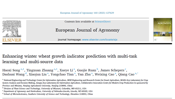 近日,成人视频 农学213班宋浩熙同学以共同第一作者在中科院农林科学领域一区TOP期刊《European Journal of Agronomy》发表了题为“Enhancing winter wheat growth indicator prediction with multi-task learning and multi-source data”的研究论文,该文提出了融合多源信息估测冬小麦生长指标的多任务学习算法框架。
