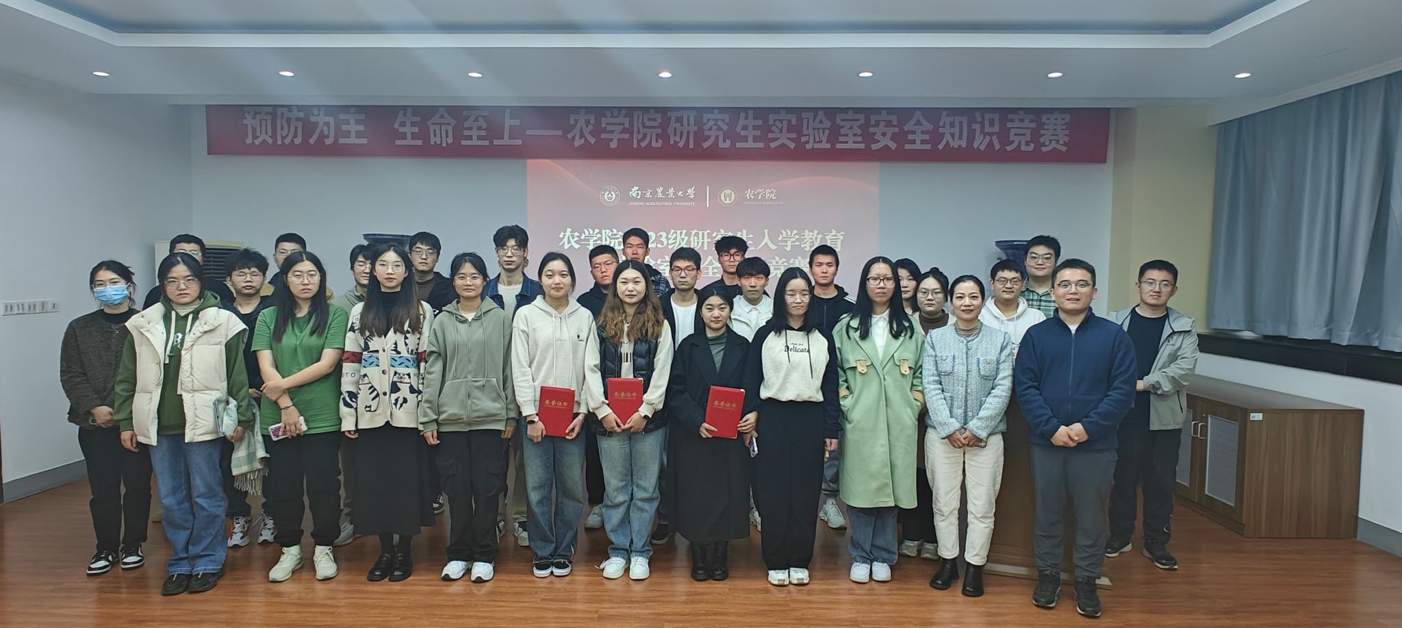 本次竞赛分为初赛和决赛两阶段。初赛队伍有8组,每组3人,最终12位参赛选手组成的4支代表队进入决赛。比赛现场气氛热烈,参赛选手准备充分,必答题结束后,各个队伍水平相当,分数差别不大。在抢答环节中,各队伍积极抢答问题,战况激烈,表现出参赛队员较强的应变能力和较大的安全知识储备量。经过激烈的角逐,来自育种32、33硕的马岑、李顺琦、许云河脱颖而出获得一等奖,来自育种31硕的杜超越、孙岳鹏、郑泽蓉获得二等奖,来自种业31硕的黄龙、李妤、姚中豪获得三等奖。获奖选手们纷纷表示,本次比赛通过以赛促学,使大家深刻认识到实验室安全的重要性。比赛结束后,辅导员陈杰老师进行了总结,他希望通过此次比赛可以营造更加浓厚的实验室安全氛围,同学们可以真正将安全意识带入到实验室的日常学习中去。