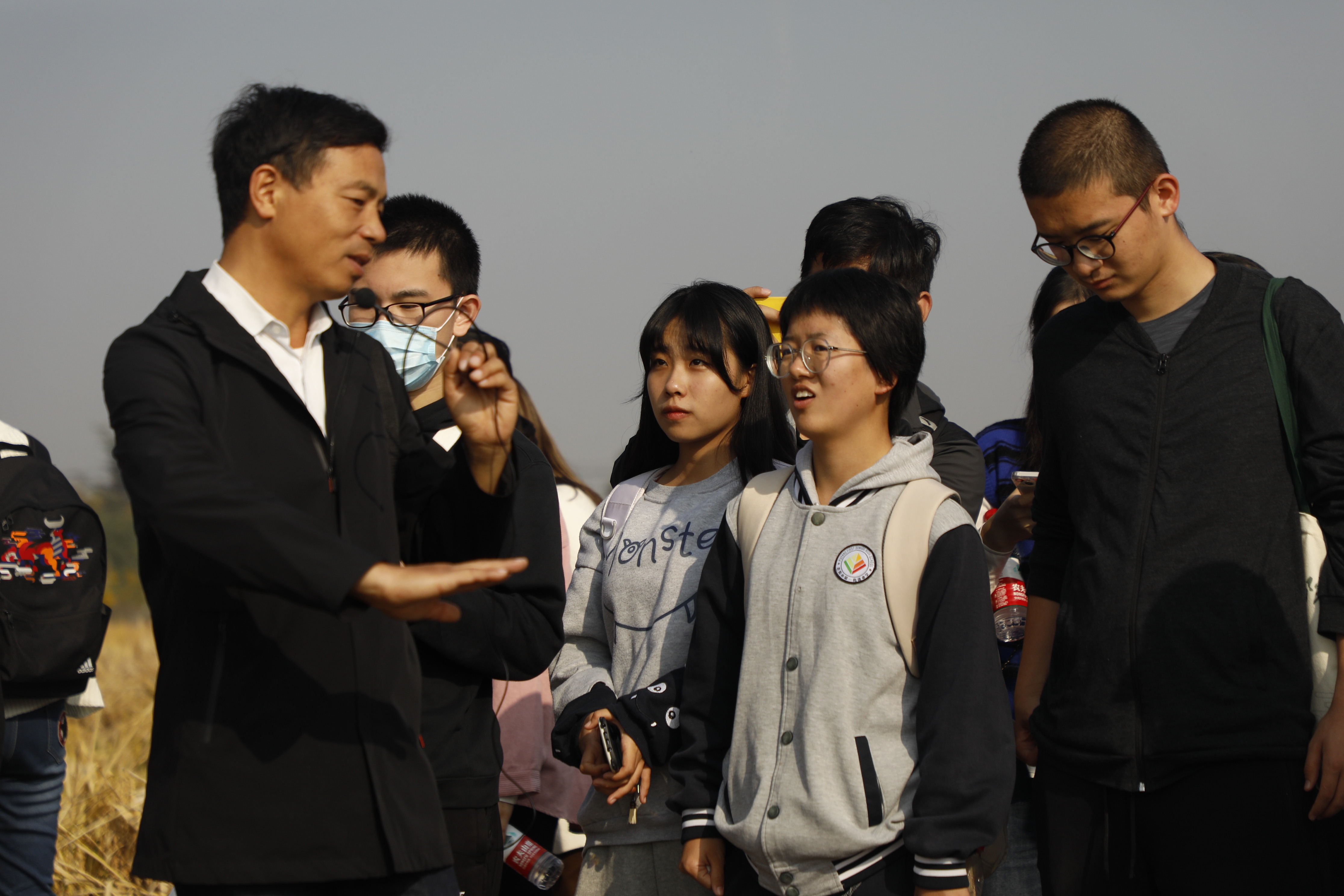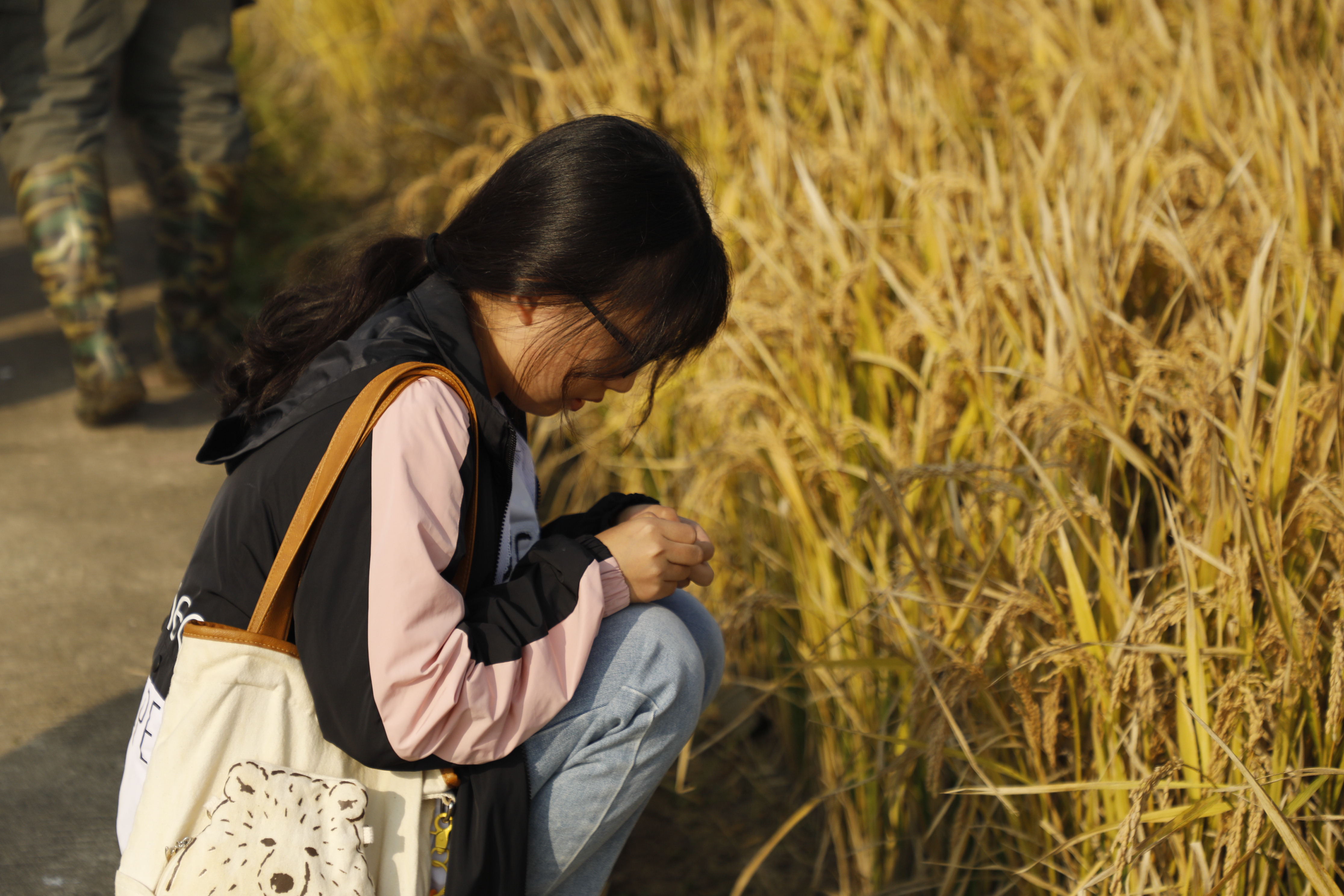 成人视频 土桥试验基地是成人视频 作物遗传与种质创新国家重点实验室和农业农村部长江中下游粳稻生物学与遗传育种重点实验室的水稻育种基地,也是南京水稻种质资源国家野外科学观测研究站的落地点。学生们到达土桥基地后,大片大片金黄稻田映入眼帘。这城市中难得一见的辽阔丰收景象与明艳色彩,勾起了同学们满满的热情与好奇。大家纷纷拿起手机拍照记录,还有做过功课的同学指着田间一个竖了标牌的田块喜道:“看!宁香粳9号,这个品种好耳熟啊,好像是得过全国品鉴会金奖的品种吧!”。