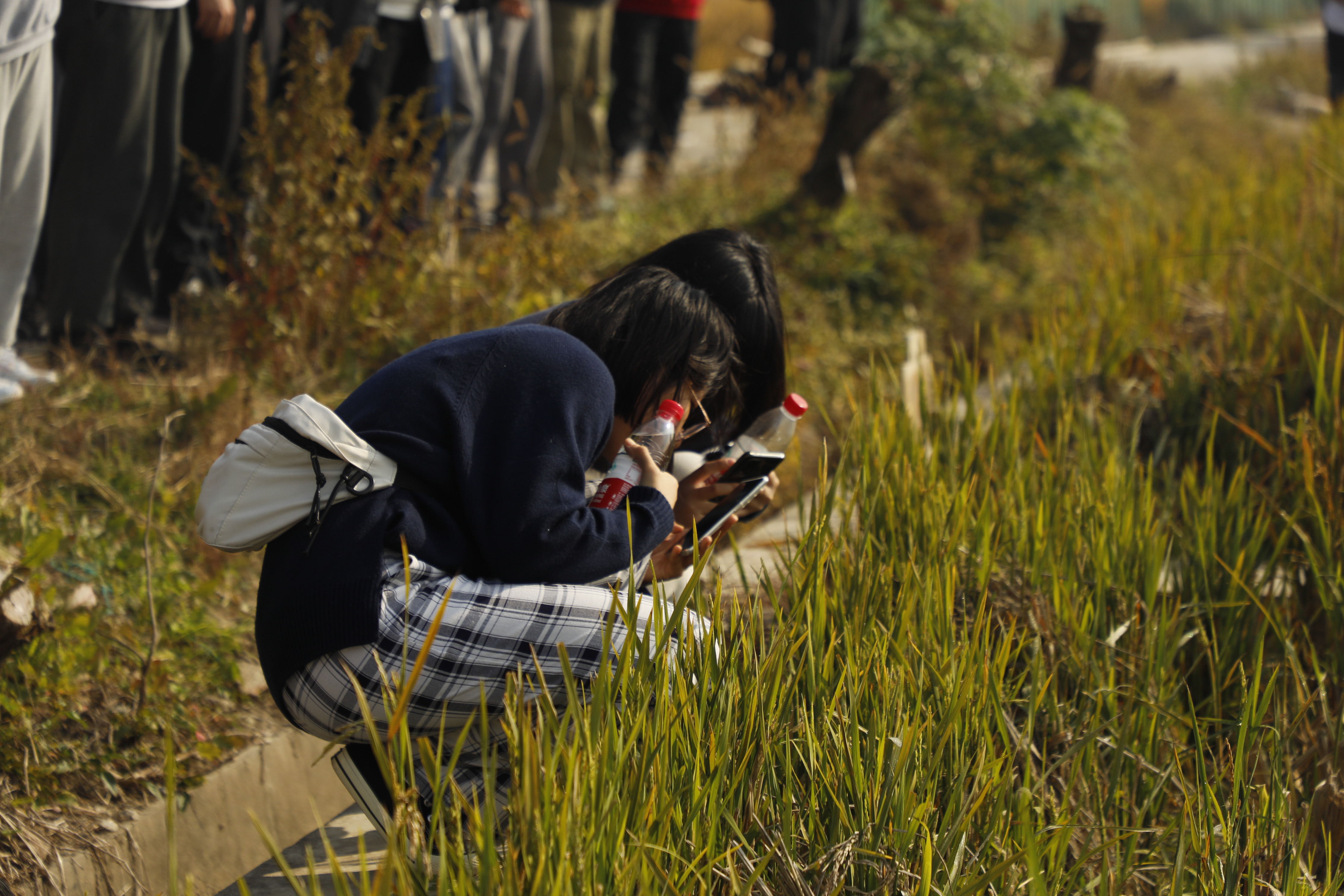 在刘老师的带领和讲解下,同学们有序地在基地中穿梭,认识了许多具有不同功能的实验圃,如植株性状各异、一眼望去高高矮矮的亲本圃,如四面都被网起来的抗虫鉴定圃,又如神秘隐匿在围墙和网盖中的转基因鉴定圃。同学们一边走一边好奇地弯腰靠近稻田,仔细观察不同水稻模样,不时地向老师提出疑问:“老师,品种选育的流程是什么?”,“我们选育出来的优良品种下一步要送往哪里?淘汰的品种又怎么处理?”,“收割之后的稻茬上长出来的苗是什么呀?”……针对这些疑问,老师都一一作了详细解答。不知不觉中,一个成熟的水稻试验基地轮廓及水稻育种工作的大体样貌,在师生们步履不停的讲学中显现出来。