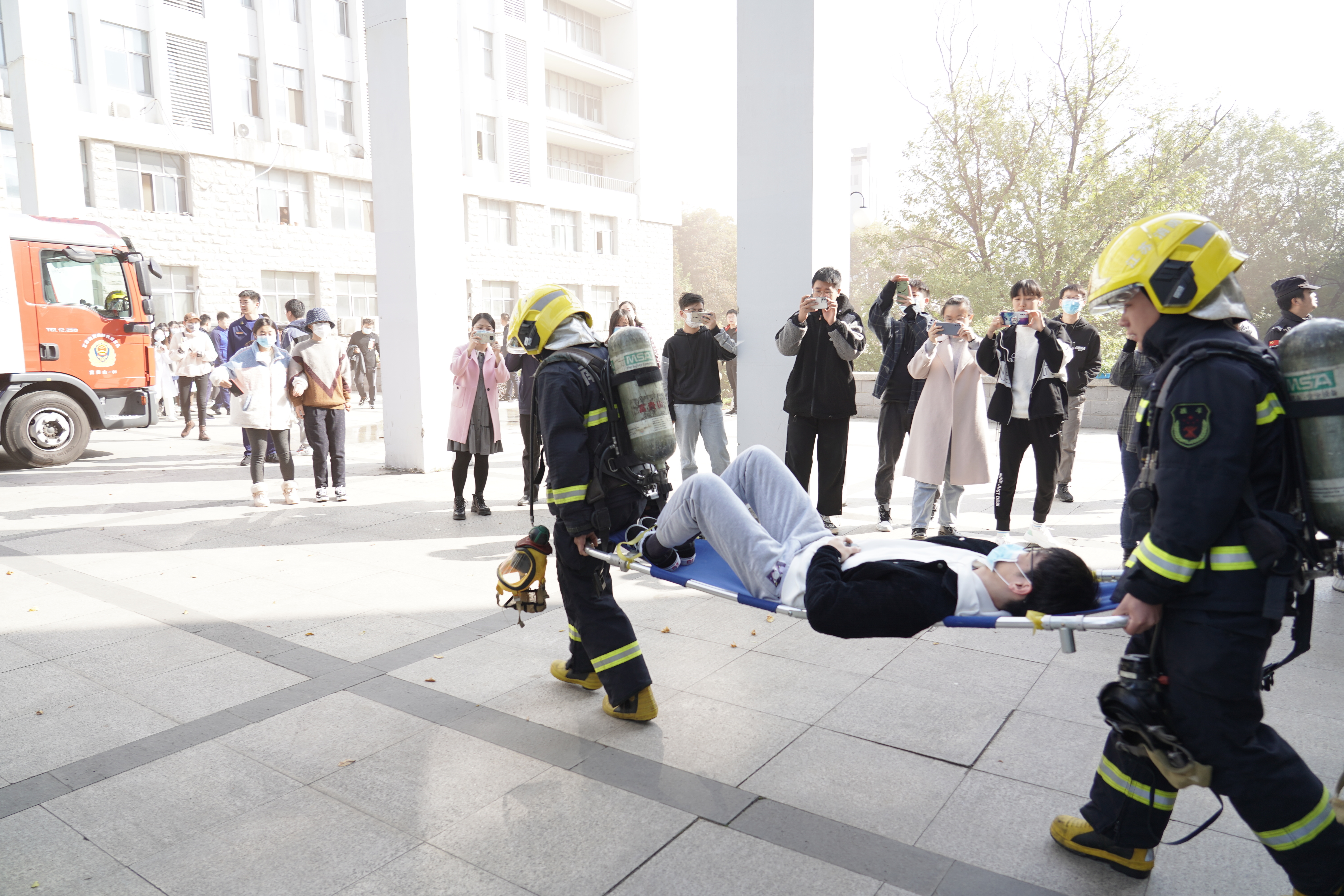 演练之前,学院对演练进行了精心策划和严密组织,明确了演练步骤、疏散路线。上午10时,随着烟饼的点燃、警报的响起,各实验室师生在工作人员的指挥下,按照指定路线,躬着腰,用手、袖口捂住口鼻,迅速有序地进行紧急疏散。全体师生很快便撤离到安全地带。