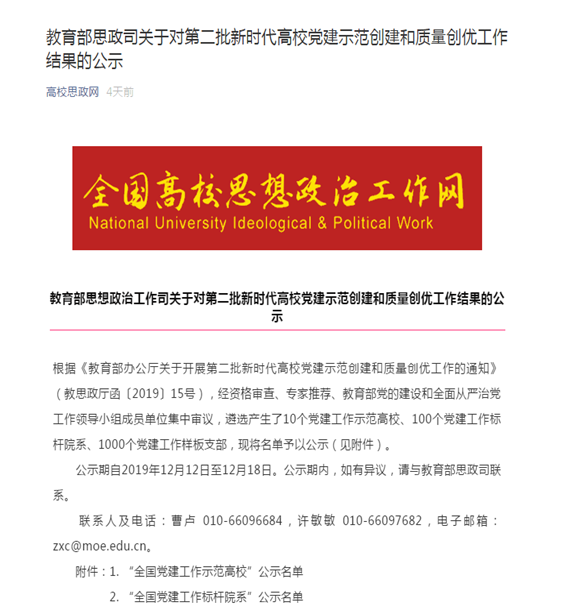近日,教育部办公厅为深入贯彻落实习近平新时代中国特色社会主义思想和党的十九大精神,深刻学习领会全国教育大会、全国高校思想政治工作会议、学校思想政治理论课教师座谈会精神,结合“不忘初心、牢记使命”主题教育,面向全国高校培育创建10所党建工作示范高校、100个党建工作标杆院系、1000个党建工作样板支部。根据《教育部办公厅关于开展第二批新时代高校党建示范创建和质量创优工作的通知》(教思政厅函〔2019〕15号),经资格审查、专家推荐、教育部党的建设和全面从严治党工作领导小组成员单位集中审议,成人视频