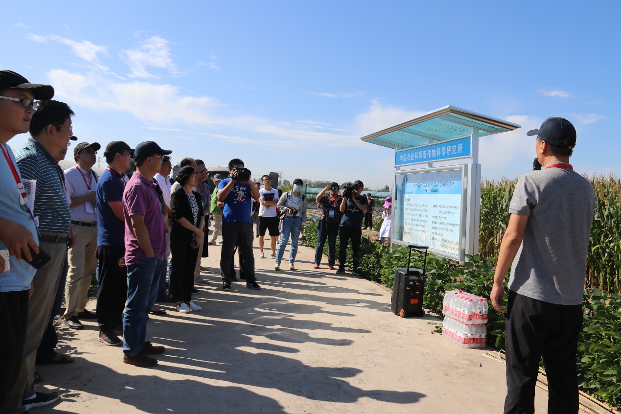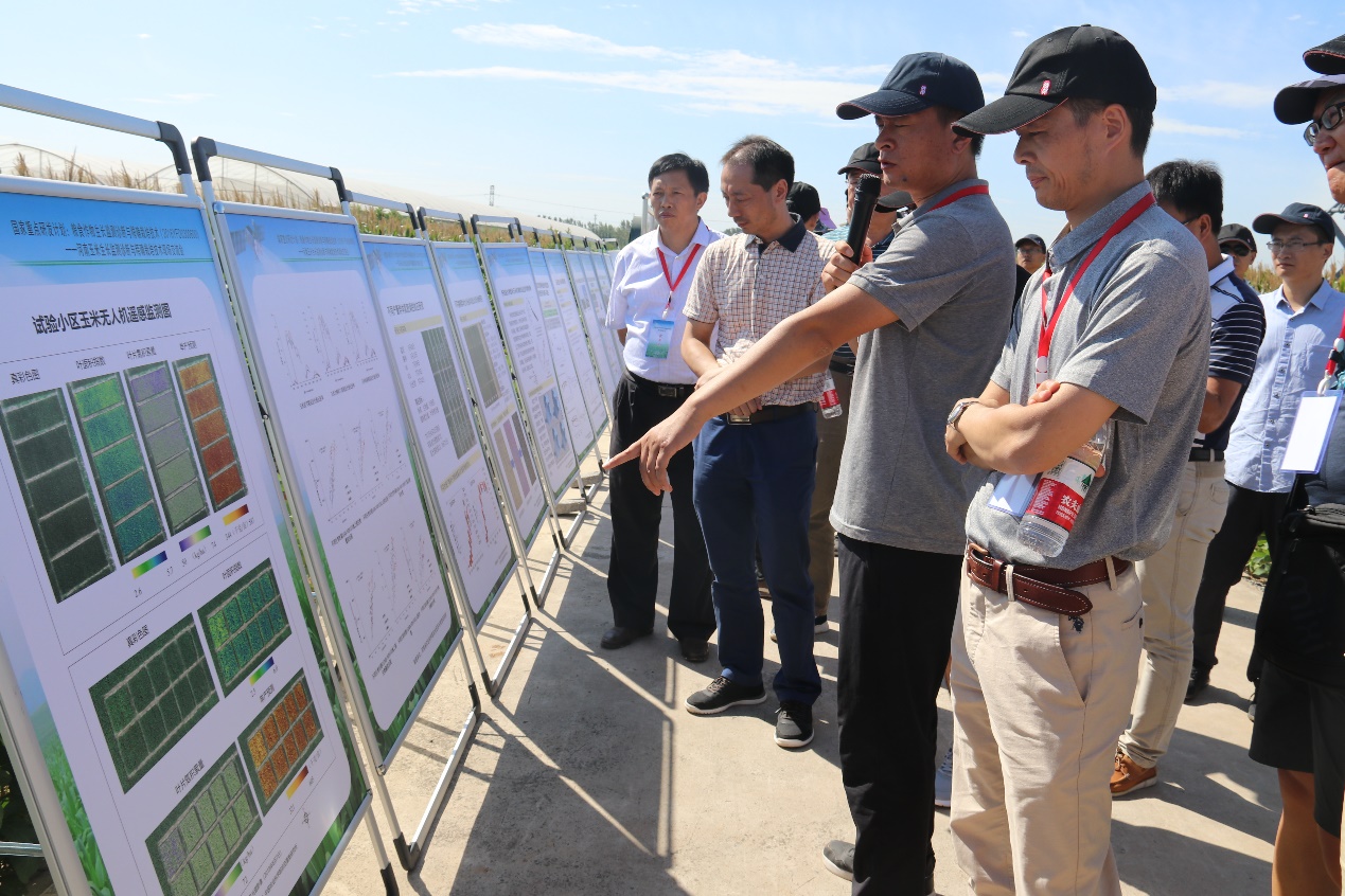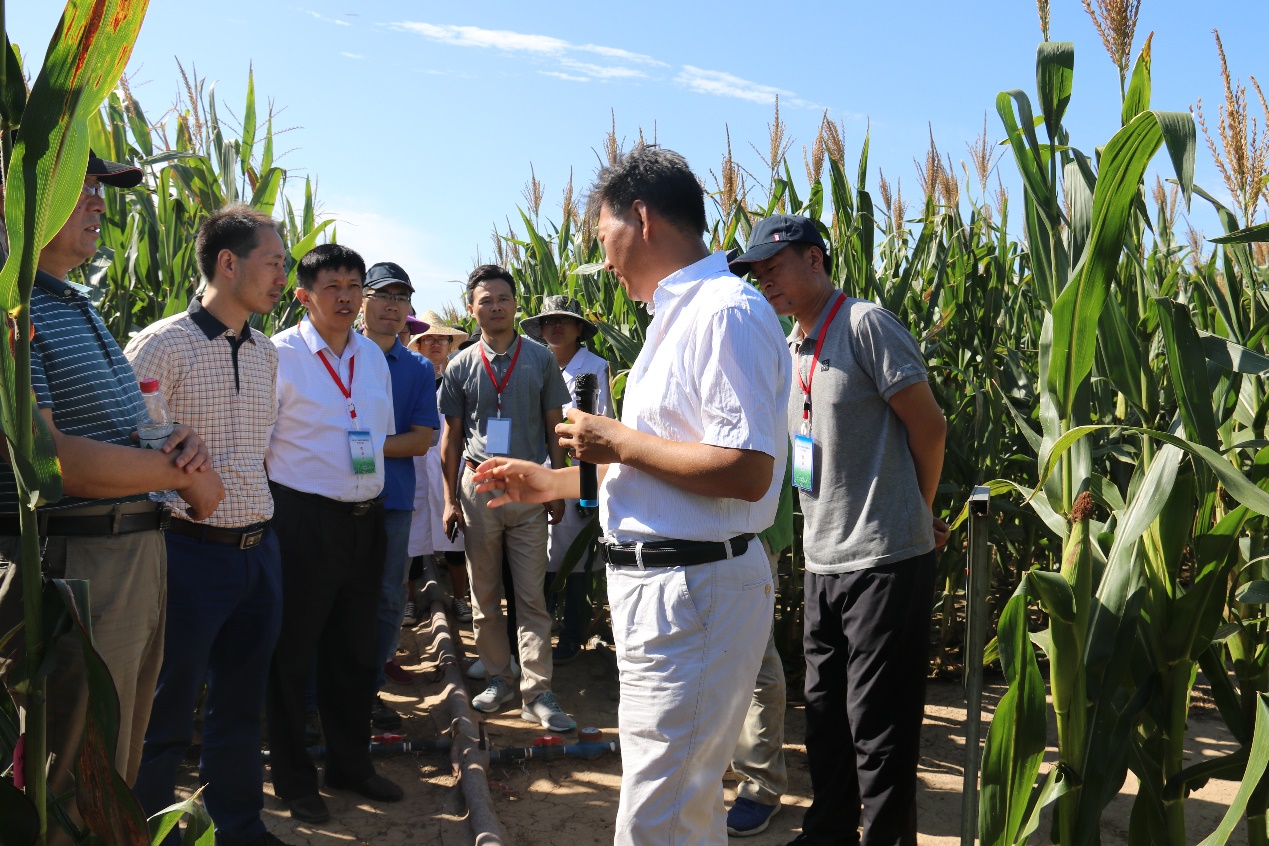 中国农业科学院作物科学研究所研究员王克如带领与会专家们深入田间进行观摩,重点介绍了玉米智能水肥控制系统、不同玉米品种的氮肥试验和不同播期的玉米试验。田间玉米植株在不同氮肥处理和品种间长势差异明显,不同播期下的玉米生育进程差异尤其显著。针对玉米植株的特点,王克如还介绍了专门用于玉米冠层监测诊断的相关技术与平台,给专家们留下深刻印象。