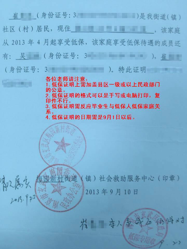 1、低保证明须包含毕业生姓名、身份证号等信息,由县(区)级以上民政部门开具并提供原件(可参照附件2)。2017届毕业生的低保证明在2016年9月1日(含)后开具的有效。