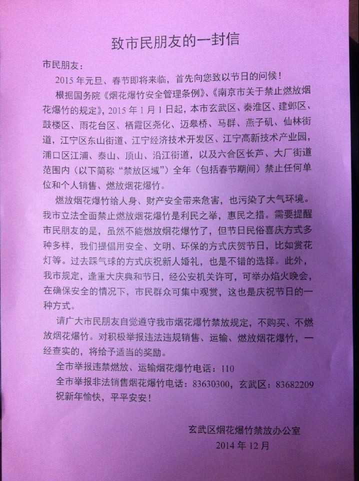 关于玄武区烟花爆竹禁放通知