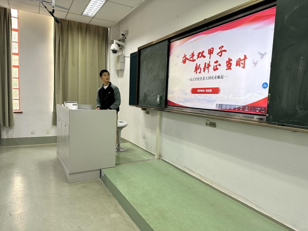 第二部分“躬耕百廿,叹不凡之路”由苏天航同学和冯雨晨同学主讲。苏天航同学详细介绍了陈裕光、章之汶、金善宝、盖钧镒、万建民等优秀人物对祖国发展的贡献。而后他从南农七君子、我校与北大荒集团的战略合作中出发,聚焦种业振兴,还介绍俄罗斯与欧美之间、墨西哥与美国之间的“不见硝烟的战争”,再次强调了种源安全的重要性。在自由讨论环节中,支部成员积极阐述了自己的观点,相互交流中大家了解到我校攻关种源问题的措施。