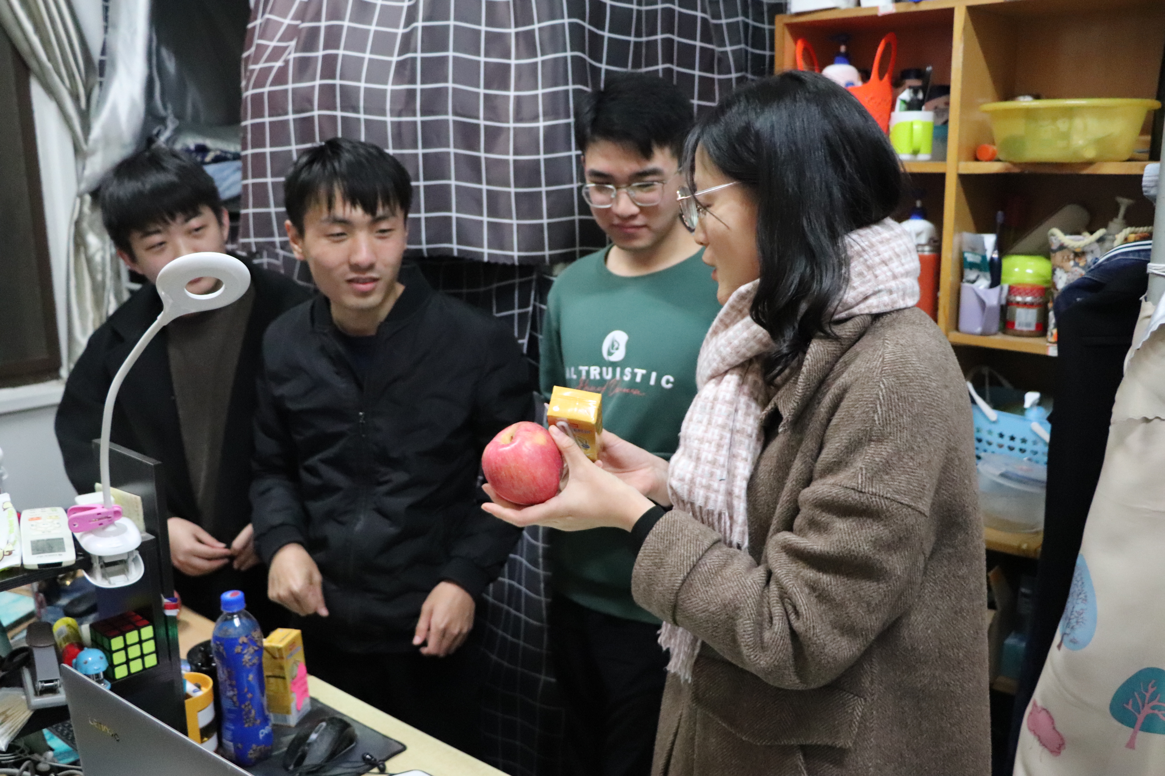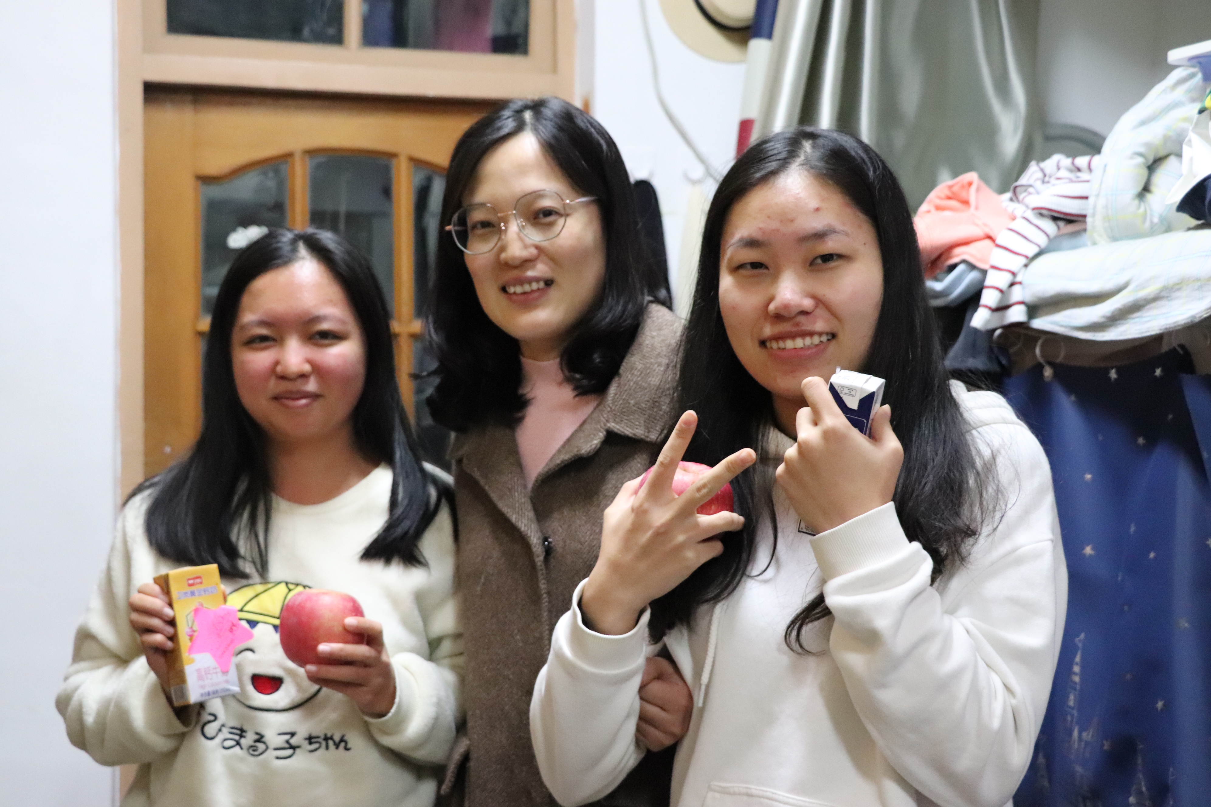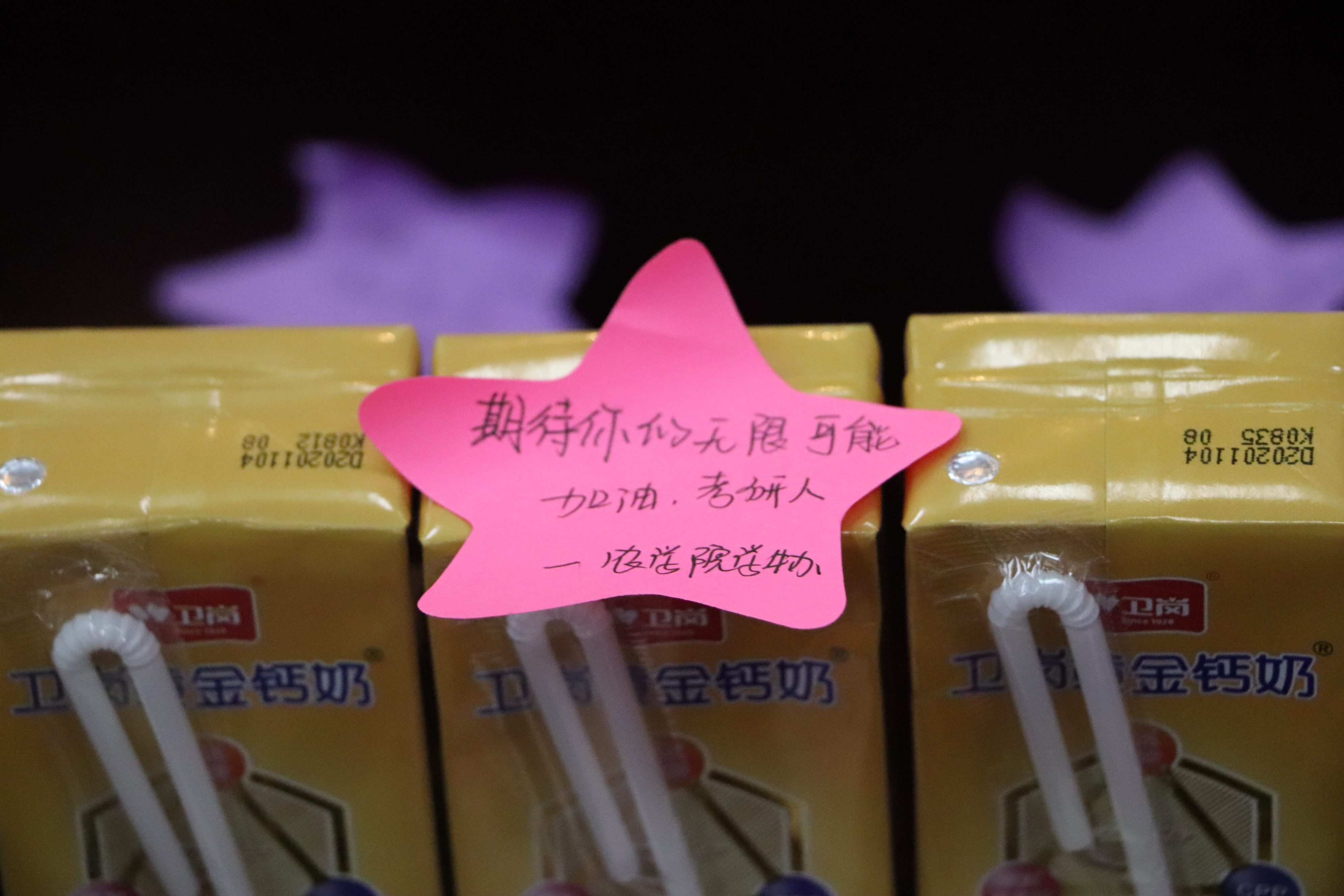 这一字一句的祝福语走进了考研学子的寝室,温暖进了考研学子的心里。满载祝福的星星贴纸装点了考研学子的寝室,也温暖了他们的心。礼包寓意期待你“牛气”满满,挟硕果归来,成人视频 是你坚强的后盾……成人视频 师生借借牛奶和苹果祝福考研学子都能取得佳绩。