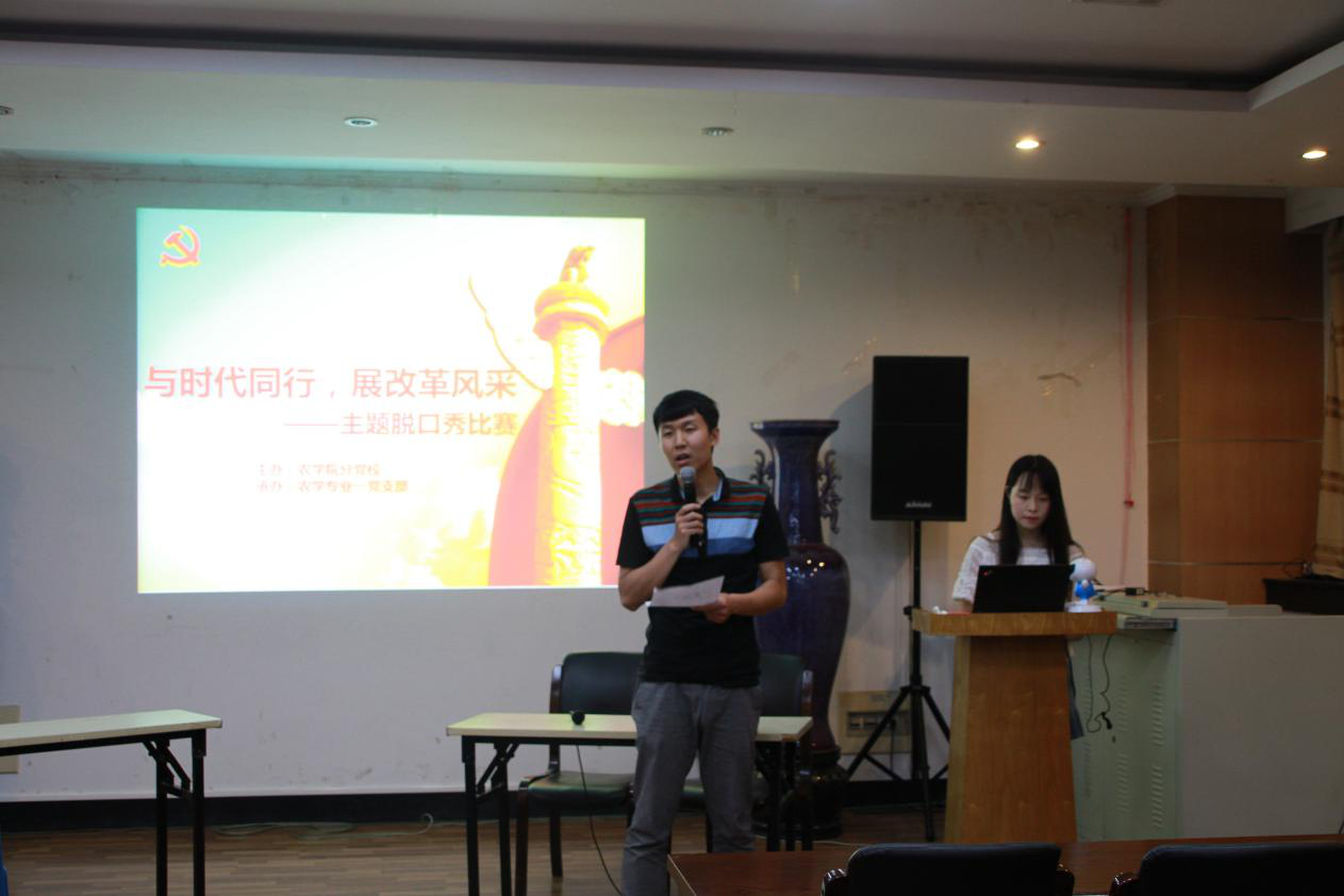 比赛第一阶段由植物实验专业党支部和种子专业党支部为大家带来脱口秀表演。植物实验专业党支部的“新闻连连播——中美贸易战”分析了中美之间的曲折关系;“深圳”则通过讲述深圳的蓬勃发展展示了中国经济的巨大突破;“浅谈教育”从学前教育到成人教育体现了改革开放以来国家对教育的重视;“生活大爆炸”则带领观众通过不同年代的镜头,感受不同年代以来生活方面发生的巨大变化。
