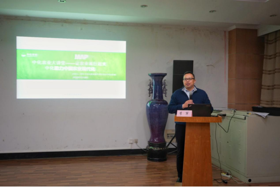 简单的自我介绍后,李总经理提出了“谈谈你对中国农业现况的认识”的问题,在场的老师同学们积极回答,就此引入了讲座内容。李总经理先是与在场老师同学一起,分析了中国农业面临的7大问题,如:土地分散、生产元素缺乏、农机使用水平低、技术人才缺乏等问题。就此问题,结合十九大提出的乡村振兴战略,提出中国农业的发展方向:科技兴农、绿色兴农、质量兴农,详细讲述了中化的MAP商业模式,新一代数字化农业服务商。最后,李总经理再一次强调了农业现状对于农业技术人才的迫切需求。