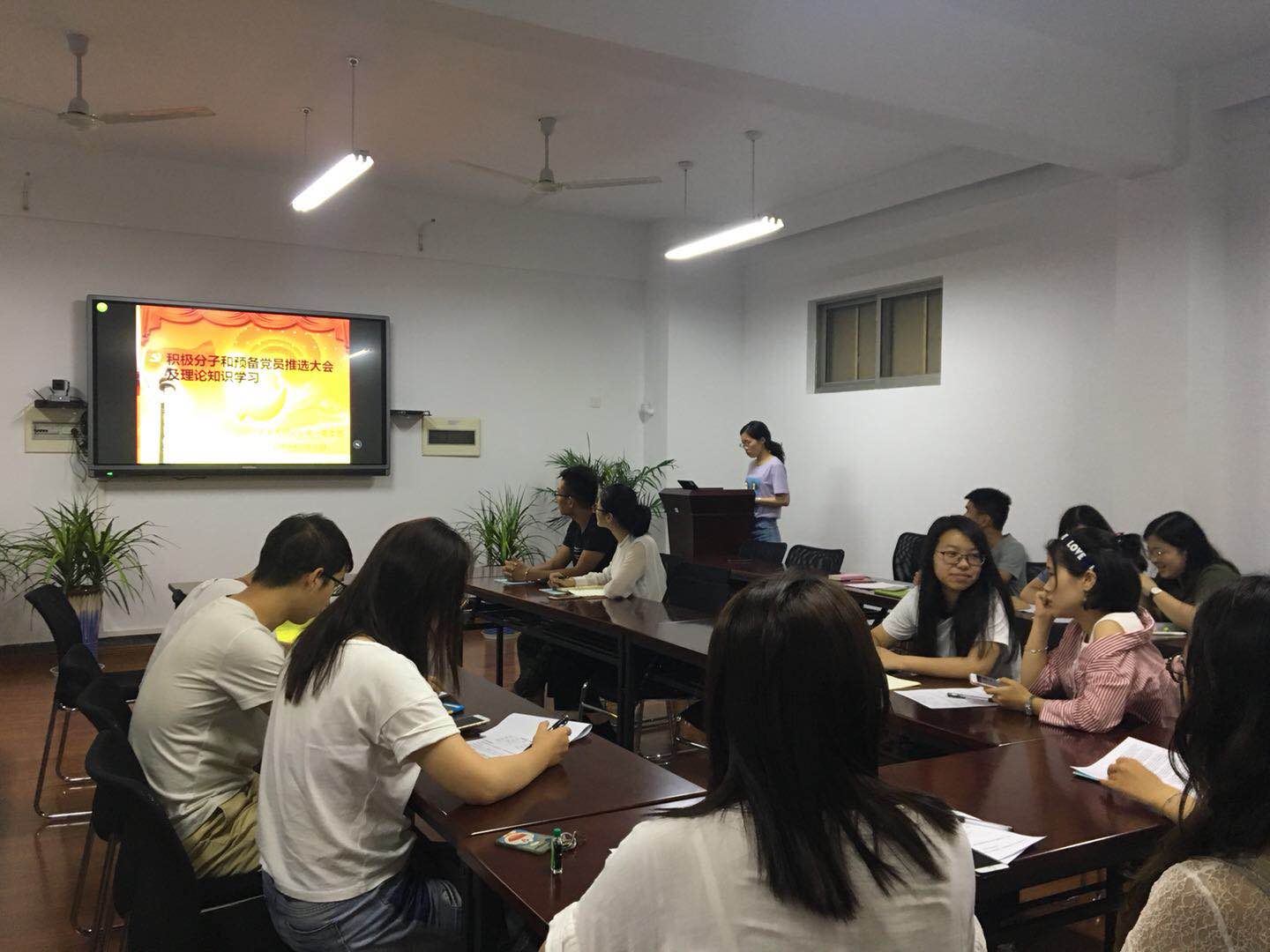 首先积极分子与预备党员竞选者通过PPT从思想、学习、活动、入党动机以及自身不足等方面进行了详细的汇报。大多数同学思想方面有不错的进步,积极向党组织靠拢,在学习和科研方面表现的表现较好。但也存在一部分同学思想深度以及行动力还有所欠缺,需要更进一步的考察。经过投票,推选出张佳、安璐为拟发展对象,李庆、夏小云、杨宗锋为积极分子候选人。预备党员与积极分子也进行了半年考核汇报。