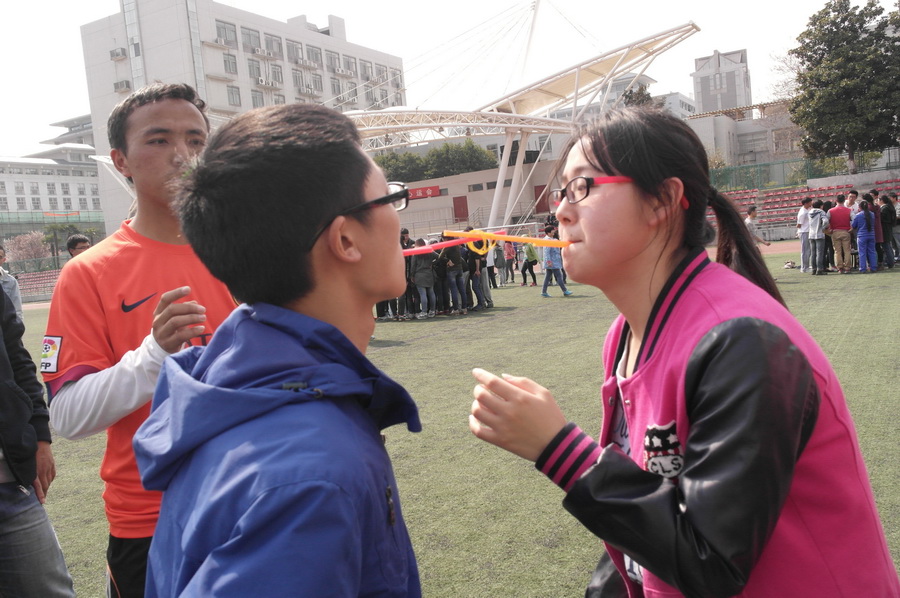 天气晴好,下午一点整,心运会准时开幕。比赛分为烽火相传、盲人方阵、盲人世界波、杯水传情、球球相吸、铃儿响叮当、提心吊胆、“筷”攻无敌手等七个项目,其中游戏之中还穿插着由各个部门准备的知识竞答环节,涉及的知识面包括娱乐八卦、红辉志愿服务知识、生活百科,娱乐八卦等多个方面。比赛开始,各班负责人引导班上同学有序的进行各项活动。裁判们认真负责,详细介绍每个活动的规则,而参加比赛的同学也积极配合。掌声、笑声、喝彩声此起彼伏,现场气氛十分活跃。