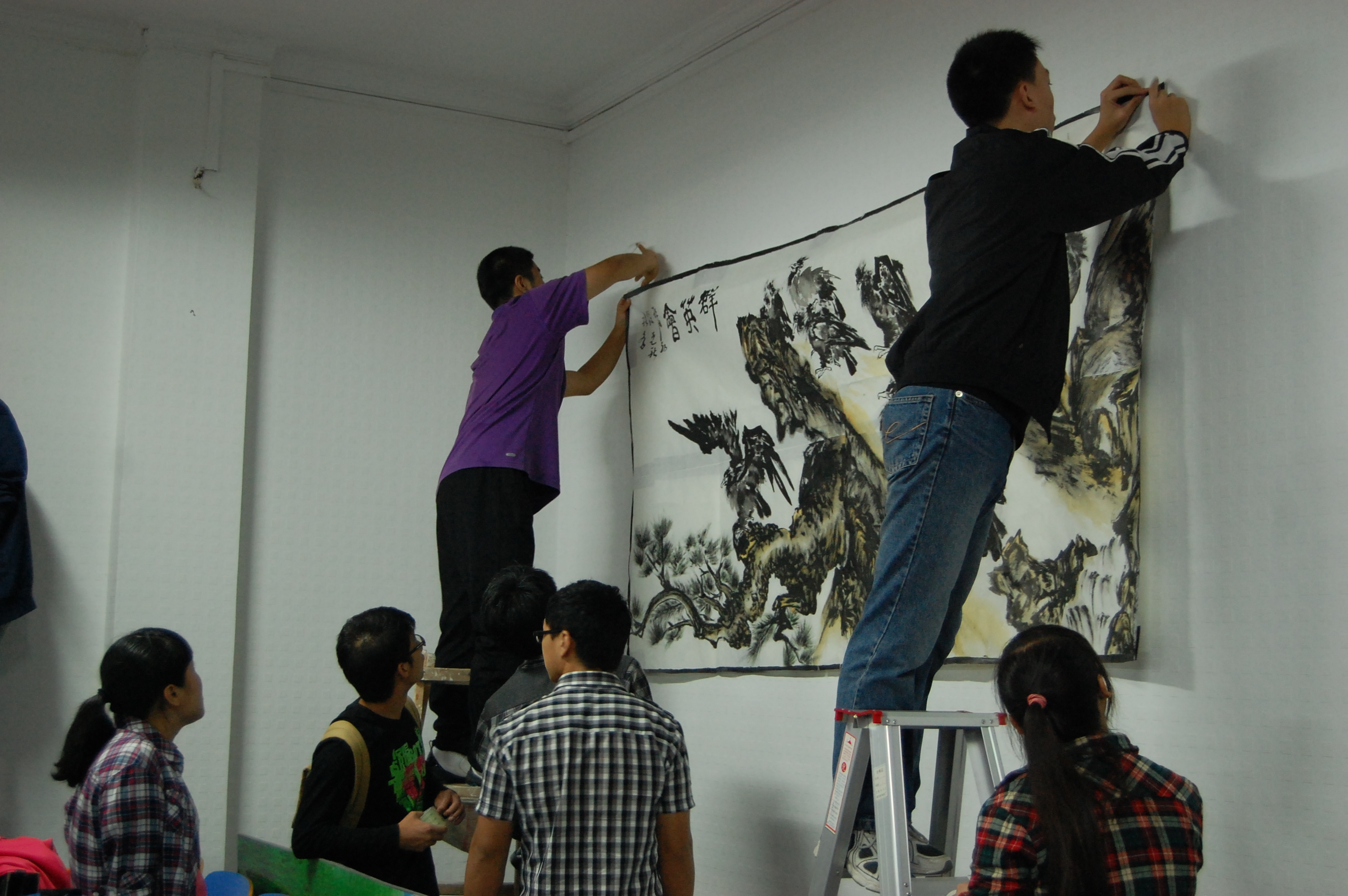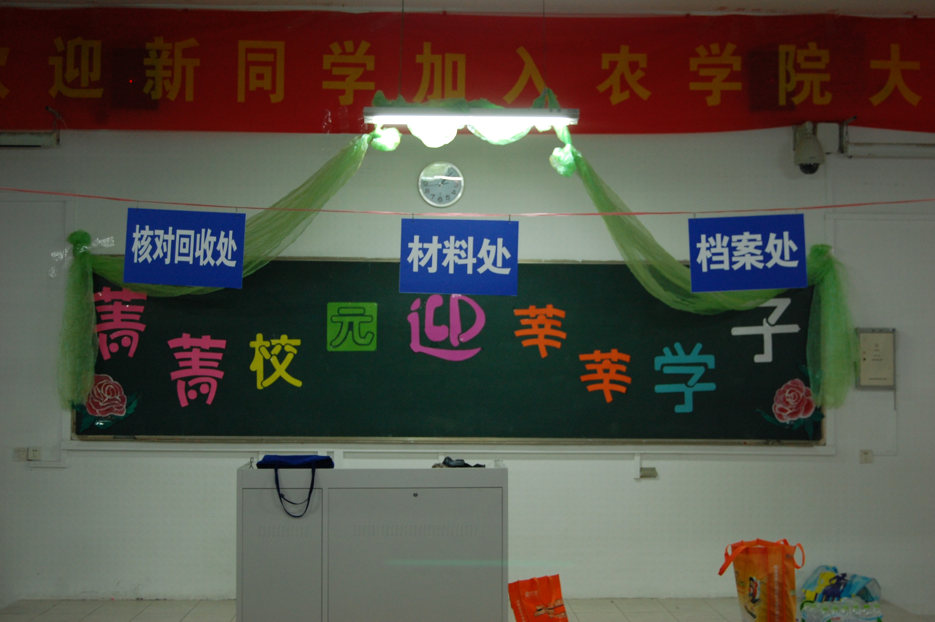 “今年的主题是‘菁菁校园迎莘莘学子’,是大家一起想出来的。会场的布置以营造温馨的气氛为主旨,让新同学们能感受到成人视频 大家庭的温暖。”学生会主席周庆鹏介绍道。门口摆放的宣传板上是学长学姐们的祝福寄语,黑板上贴着醒目的标语彩纸,窗户上装饰的是同学们吹出的五彩气球,墙壁上是动感的人物剪影贴纸。更有一幅气势雄浑的大型中国画为会场增添了浓浓的中国风,这幅画是才华横溢的宣传部部长丁园的杰作。大家团结协作,互帮互助,将成人视频 迎新会场布置的温暖美丽。