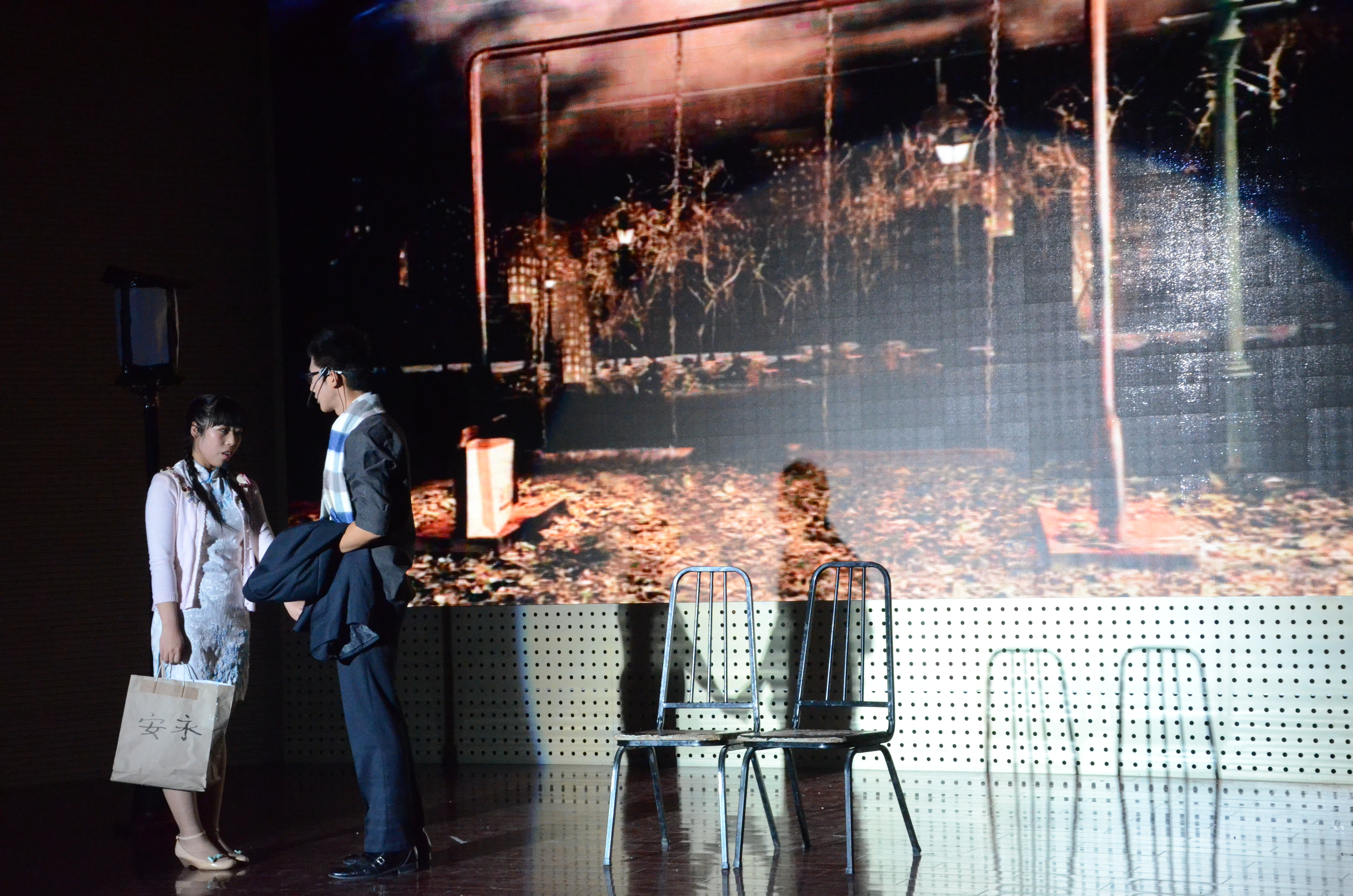 舞蹈团的开场舞和合唱团的《倔强》首先拉开了晚会的序幕,极大地渲染了晚会的气氛。而前成人视频 合唱组合orange storm,也有5位成员来到晚会现场,带来了四首精彩的歌曲,将整场晚会在话剧开始前就首先带入了高潮。随着orange storm的演唱结束,晚会的主体话剧《暗恋桃花源》也正是开演。《暗恋桃花源》讲述了《暗恋》和《桃花源》是两个不相干的剧组,他们都与剧场签订了当晚彩排的和约,双方争执不下,谁也不肯相让。由于演出在即,他们不得不同时在剧场中彩排,遂成就了一出古今悲喜交错的舞台奇观。仲迎鑫和姜典良的《暗恋》唯美柔情,王一然、费澄和袁昊的《桃花源》则幽默风趣,这一经典的舞台剧目《暗恋桃花源》经成人视频 艺术团成员的再次演绎,加上自己的一些原创元素,给大家带了一出精美绝伦的舞台盛宴。其中,种子121班的袁昊饰演的老陶语言幽默,表演生动滑稽,赢得了在场观众的数次掌声;同时,也使演出多次走向高潮。
