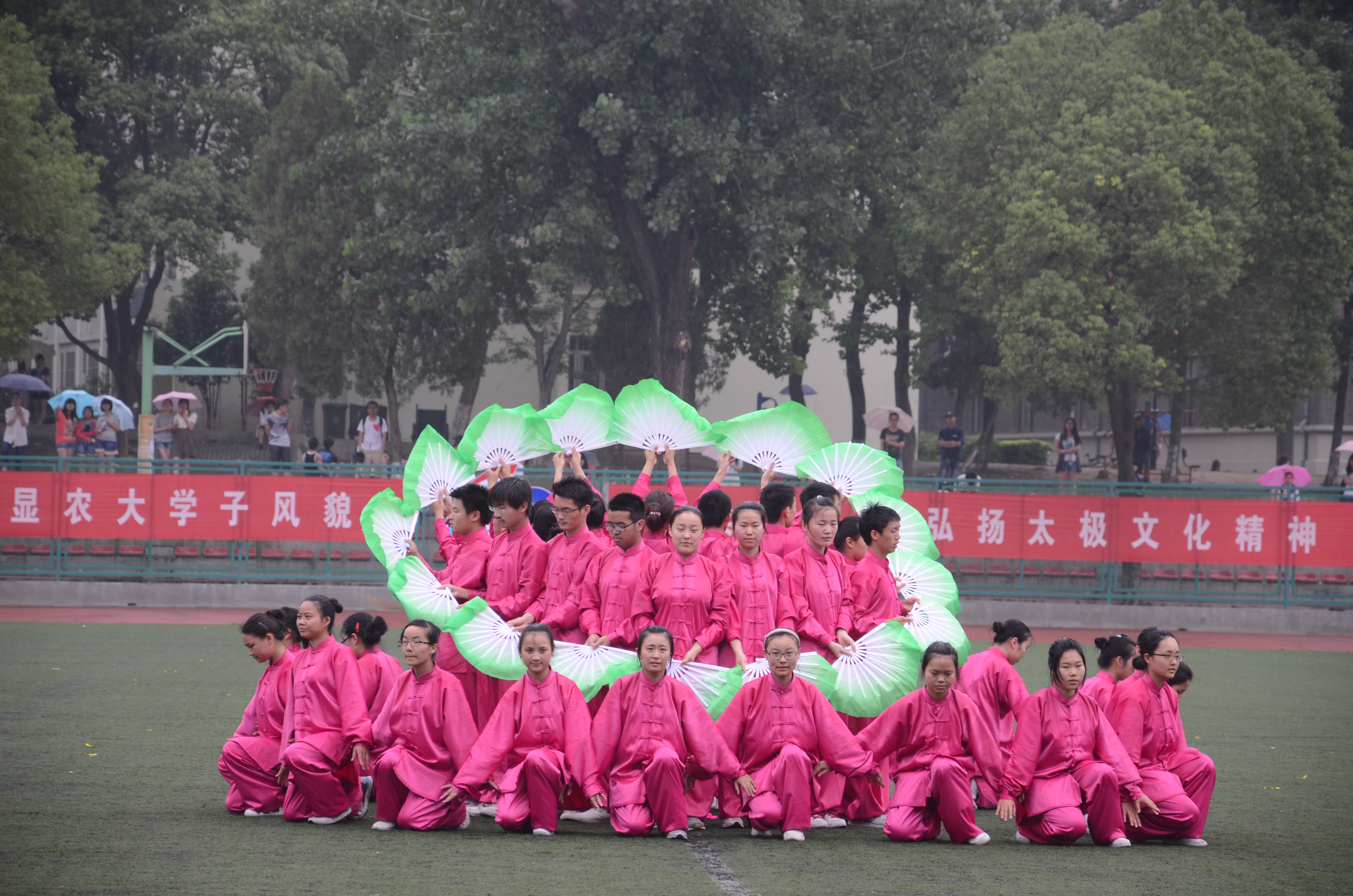 经过50多天辛苦训练,成人视频 代表队以饱满的精神状态参加了比赛。身着玫红色太极服的队员们构成了比赛场上一道亮丽的风景,巾帼须眉,相得益彰。以第十的出场顺序的成人视频 ,柔美清新的太极舞让评委与观众眼前一亮,整齐划一的太极展示更是获得了一阵阵的叫好,尽管天空下着小雨,但仍不能阻挡太极队员的参赛热情。经过两个多小时的激烈角逐,太极比赛完美谢幕,成人视频 以微弱差距排名第四,获得二等奖。